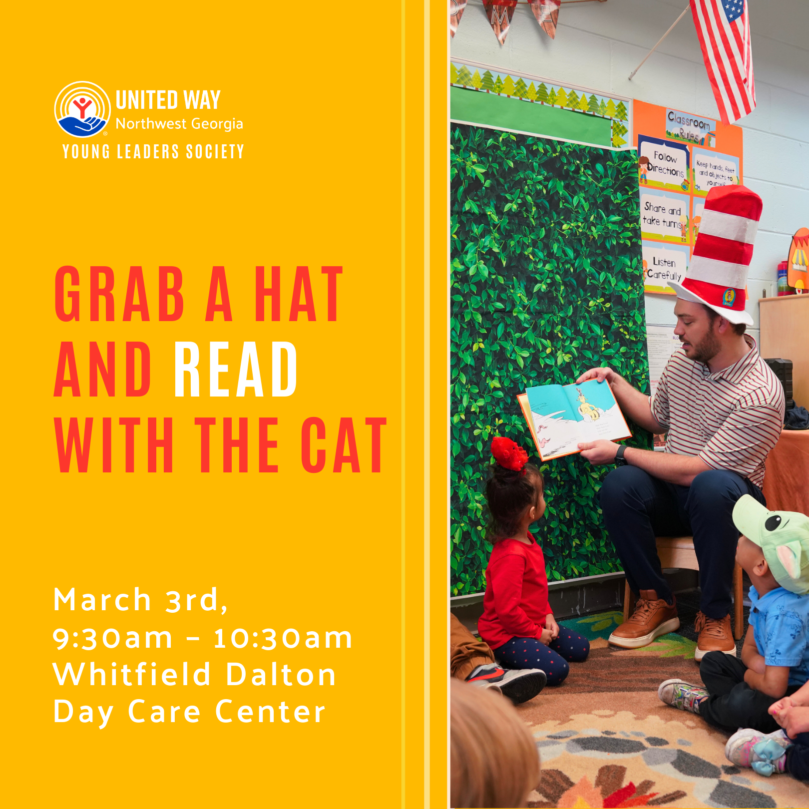 United Way of Northwest Georgia's Young Leaders Society is going to Dalton Whitfield Day Care on March 3rd to read to children. We'll celebrate Read Across America Day by reading to kids at Whitfield Dalton Daycare Center. Be sure to join YLS for our annual Grab a Hat and Read with the Cat event!